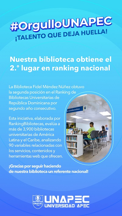 La Biblioteca Fidel Méndez Núñez obtuvo la segunda posición en el Ranking de Bibliotecas Universitarias de República Dominicana por segundo año consecutivo.